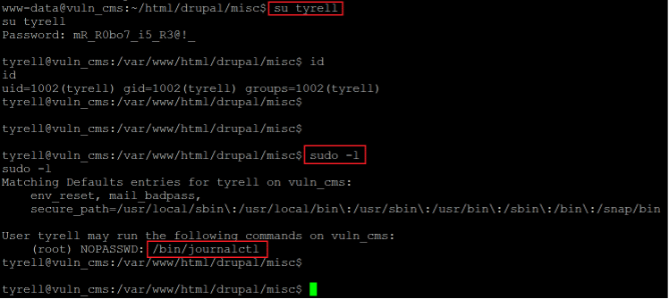 The login was successful, and we are now logged into the target machine as user' tyrell.' Before exploring this user further, we checked the current user privilege by using the 'sudo –l' command. From the command output, we could identify a utility which the current user can run as root.