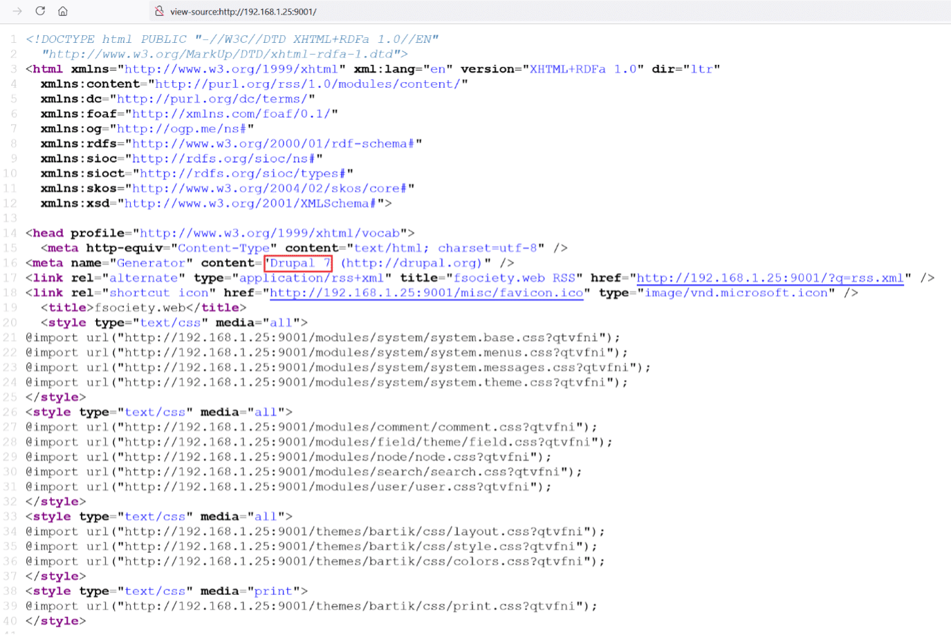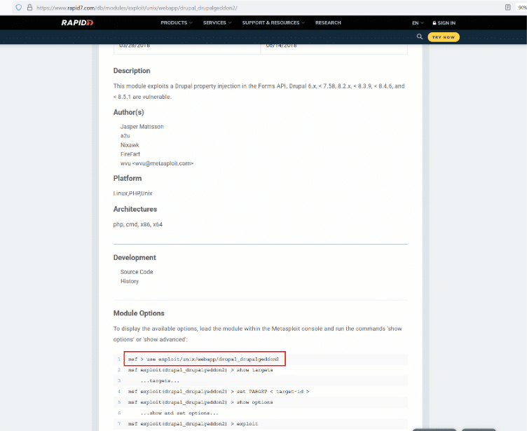 As can be seen, highlighted in the above screenshot, we found that the website is made using Drupal CMS, and the version being used is Drupal 7. We researched the internet to find vulnerabilities and available exploits for this version of Drupal CMS. After some research, we finally came across an exploit which was available in Metasploit Framework. Since we are using Kali Linux as an attacker machine, so it comes with preconfigured Metasploit community version. The module and website details can be seen below.