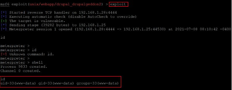 Command used: <<use exploit/unix/webapp/drupal_drupalgeddon2>>