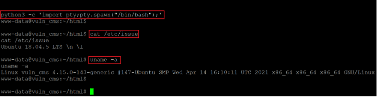 After getting the stable shell, we used a few commands to identify the target machine operating system and kernel details. The details can be seen in the above screenshot. We searched the web to find an exploit for the operating system and kernel versions, but none could be found.