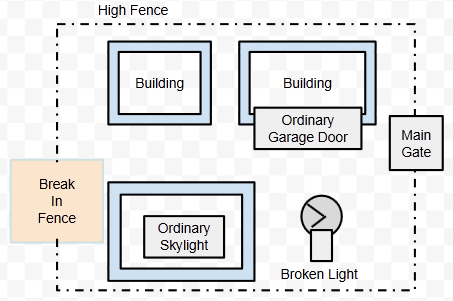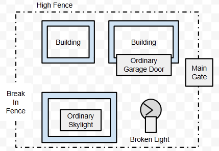 The hotspots here would be "break in fence," "broken light," "ordinary skylight" and "ordinary garage door." The most serious weakness of those four is obviously the big break in the fence.