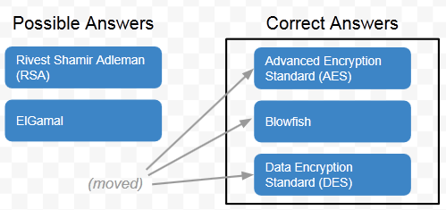 To solve the question, simply click, drag and drop each correct answer from the "Possible Answers" section to the "Correct Answers" box. In this case, we should drag-and-drop AES, Blowfish and Triple DES into the "Correct Answers" box.