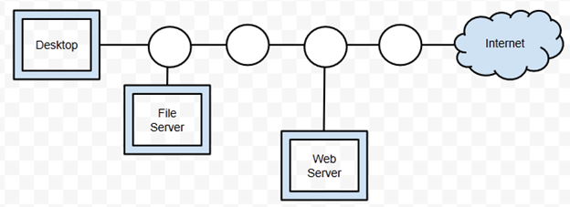 - D) Between all company resources (desktops, the file server and the web server) and the Internet (The web server would use the same segment as other resources but different firewall rules — this is called a "DMZ")