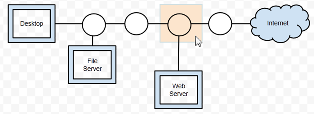 2. To secure outbound connections from internal computers, protect internal resources from inbound connections from the internet, and use a separate "DMZ" segment to allow web connections from the internet, the security practitioner wants to deploy a single firewall. Click on the area below where the firewall should be placed.