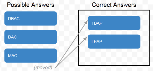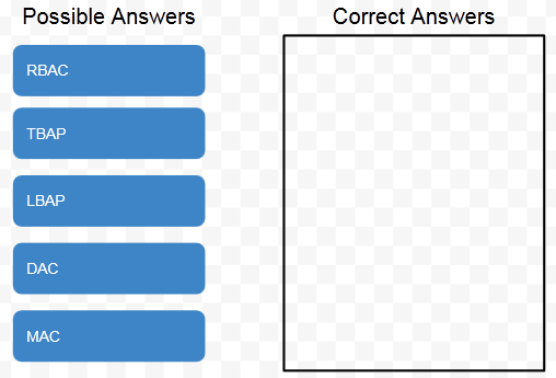 Before simply dragging and dropping DAC, RBAC and MAC from left to right, you need to pay close attention to the word "NOT" in the question. With that in mind, the correct answers to this question are simply TBAP and LBAP. (Also note that not every drag-and-drop question has three correct answers — the number will vary!)