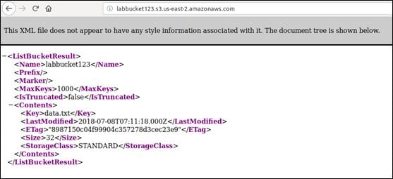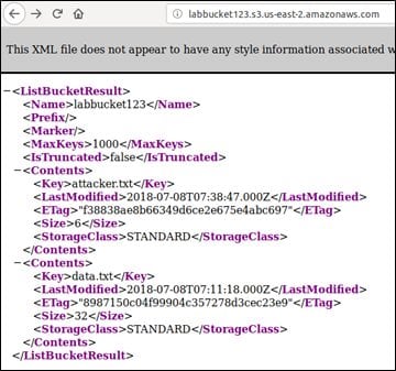 As you can see, the region is specified as the U.S. Bucket Finder found a bucket as expected. Now we can simply access the URL labbucket123.s3.amazonaws.com and we should be able to see the list of objects available.