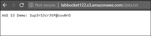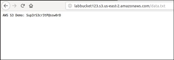 As you can see in the above figure, the bucket has an object (data.txt) publicly accessible. Let's access the URL and see if we can access its content.