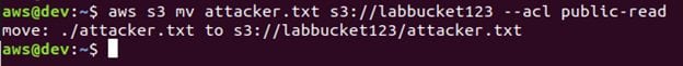The above figure shows that we are interacting with the S3 service and moving the attacker.txt file to labbucket123 bucket with the public-read ACL.