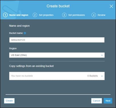 Enter a unique bucket name as shown in the preceding figure. This name must be unique across all the existing buckets in Amazon S3. In this example, labbucket123 was chosen to be the bucket name and is available.