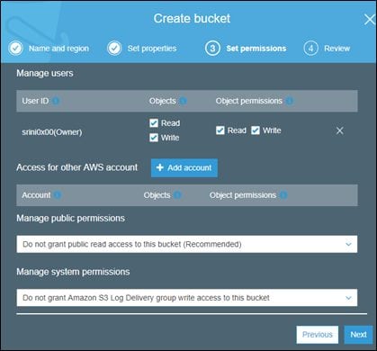 Click Next, and you should see that all the properties (such as logging and encryption) are disabled by default. We're not changing them now, so let's click Next again and choose the permissions as shown below.