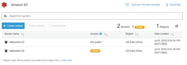 This new bucket is named labbucket122. The following figure shows that the newly-created bucket is not public.