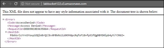 As we can see in the above output, the new private bucket is found to be available, but access is denied. Accessing this bucket returns the following error.
