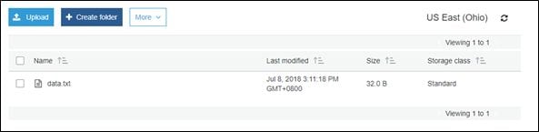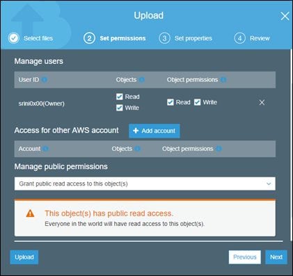 Leave everything else to default and click Upload to upload the object to our bucket. It looks as shown below.