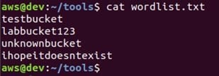 This tool requires a wordlist, and it will check each word to see if that bucket name exists in Amazon's S3. Here is the wordlist I have created for demo purposes:
