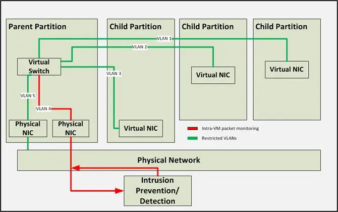Figure 10-8 depicts a VLAN configuration using virtual switches in Windows Server 2012 to manage access across multiple VMs on the same hardware platform. Whether using virtual or physical switches, VLAN segmentation as described in Chapter 5 is a crucial part of attack surface reduction and isolation of servers sharing hardware resources.