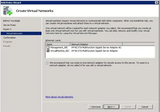 Figure 10-6 shows the Microsoft physical NIC assignment window. When configuring the Hyper-V server role, you are asked to assign a NIC to the VMs or to the MOS. An unchecked NIC is automatically assigned to the MOS.