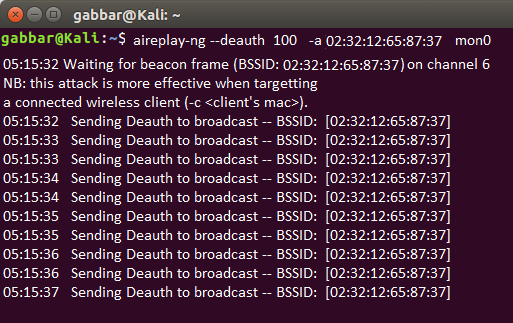 - aireplay-ng --deauth 100 -a 02:32:12:65:87:37 mon0