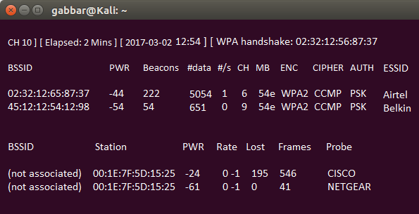 - airodump-ng --bssid 02:32:12:65:87:37 -c 6 --write WPA2crack mon0
