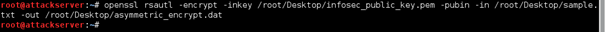 openssl rsautl -encrypt -inkey /root/Desktop/infosec _public_key.pem -pubin -in /root/Desktop/sample.txt -out /root/Desktop/asymmetric_encrypt.dat