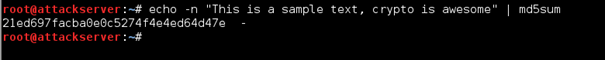 To get an MD5 hash of a plaintext phrase using your terminal, execute the following command: echo -n "This is a sample text" | md5sum