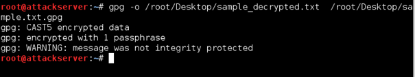 gpg -o /root/Desktop/sample_decrypted.txt /root/Desktop/sample.txt.gpg