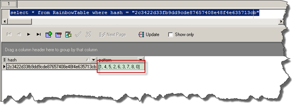 A previously made dictionary can be downloaded in the reference section and, using any SQLite browser, you can easily find the original pattern scheme: Select * from RainbowTable where hash = "2c3422d33fb9dd9cde87657408e48f4e635713cb".