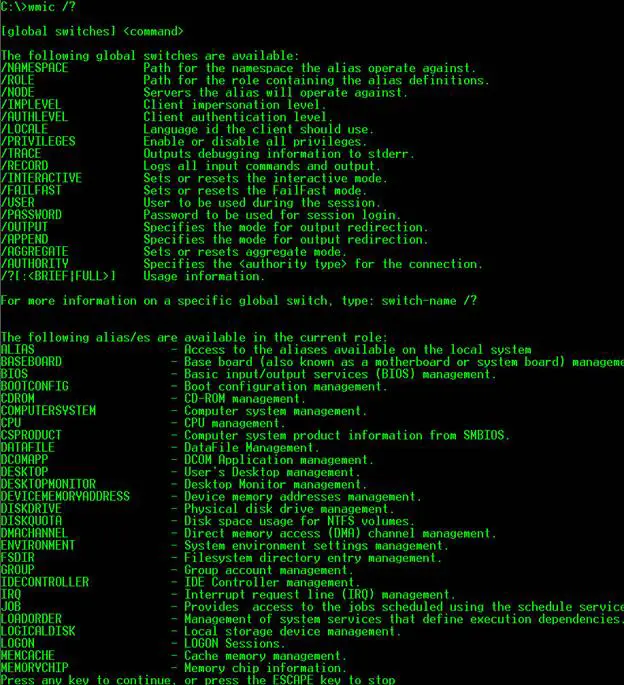 Lets enumerate the commands contained in the wmic extension in cmd.exe, just type /?