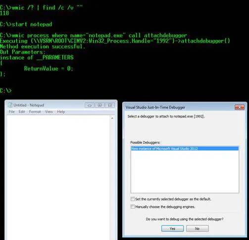 C:wmic process where name = "mal.exe" call attachdebugger