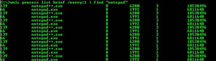 C:wmic process list brief /every:1 | find "mal.exe"