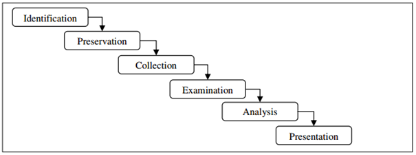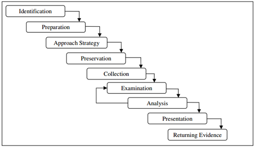 The first phase is Acquisition, where evidence is acquired with approval from authorities and in an acceptable manner, it's followed by Identification step whereby all evidence is transformed from digital format to a human understandable format. The Evaluation phase comprises of tasks that determinate the accuracy of gathered evidence, and if indeed they can be considered as relevant to the being investigated case. The final step is Admission where all extracted evidence is presented.