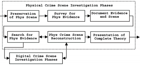 Both phases include Preservation, Survey for Physical/Digital Evidence, Document Evidence and Scene, Search for Physical/Digital evidence, Physical/Digital Crime Scene Reconstruction and Presentation of Physical/Digital Scene Theory. The latest phase of the model is the Review phase in which the whole process is reviewed to find points of improvements and to identify new procedures or new training requirements.