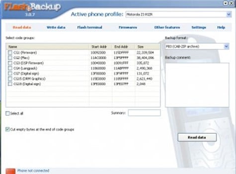 The examiner can click on Read data. It will show a list of code groups available. Select the appropriate region groups or select all, then you have to choose a backup format. The tool support "SBF" (Single Binary File) will create a single large file, "SMG." (Binary files) will create a separate file for each memory section, CAB-ZIP, and other formats.