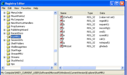 An example of an MRU list located in the Windows Registry is the RunMRU key. When a user types a command into the "Run" box via the Start menu, the entry is added to that Registry key. It's location is HKCUSoftwareMicrosoftWindowsCurrentVersionExplorerRunMRU. The chronological order of applications executed via "Run" can be determined by looking at the data column of the "MRUList" value. The letter "a" represents the first command typed in the "Run" box, and the letter "g" represents the last command typed in the "Run" box.
