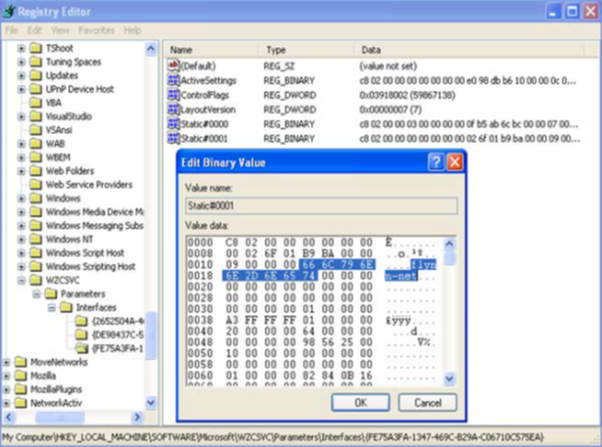 A network or hotspot connection to a computer is identified by its SSID. A SSID is logged within Windows XP as a preferred network connection. It can be found in the Registry in the HKLMSOFTWAREMicrosoftWZCSVCParametersInterfaces key. The Registry key parents multiple subkeys and they should contain the values "ActiveSettings" and "Static#0000". There are also values that begin with "Static#" and are sequentially numbered. In the binary data of "Static#" values are the network SSIDs of all the wireless access points that system has connected to. That can be seen by right clicking the value and selecting "modify" button.