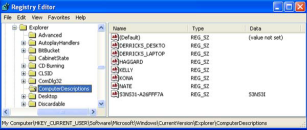 The Registry key HKCUSoftwareMicrosoftWindowsCurrentVersionExplorerComputerDescriptions contains information on computers connected on a LAN. The ComputerDescriptions key is useful in determining whether or not a user was connected to certain computers or belonged to a specific LAN.