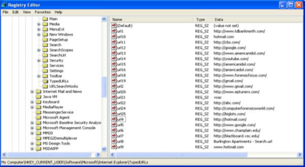 Internet Explorer stores its data in the HKCUSoftwareMicrosoftInternet Explorer key. HKCUSoftwareMicrosoftInternet ExplorerMain is one of the three sub keys and stores the user's settings in Internet Explorer. It contains information like search bars, the start page, and form settings. The second sub key is HKCUSoftwareMicrosoftInternet ExplorerTypedURLs and it contains the browsing history of the particular user.