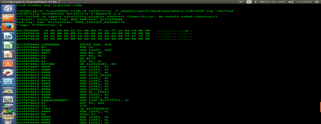 Now we will go with deep analysis implementing Volatility Framework. Using the malfind option we can see which processes are injected for hooking with disassembly option.