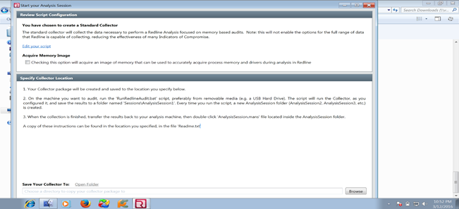 This option will create a folder which can be used for audit purpose of a victim machine in which malware(artifact) is running. This will create RunRedlineAudit.bat, which will collect necessary information that can be audited by redline. We just to create a folder on the machine where Redline is running using collector option where it will create the bat file. We have to take that batch file either by USB or shared network folder to the victim machine.