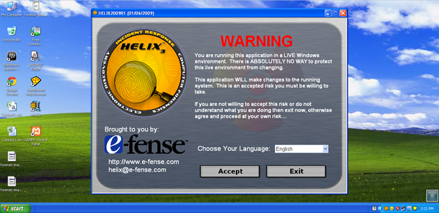 Helix3 is a live CD for doing computer forensic investigation and incident response. It is built on top of Ubuntu and comes in both free and commercial forms. This article will cover working with the free Helix Live CD. You can download the live CD from: https://www.e-fense.com/store/index.php?_a=viewProd&productId=11