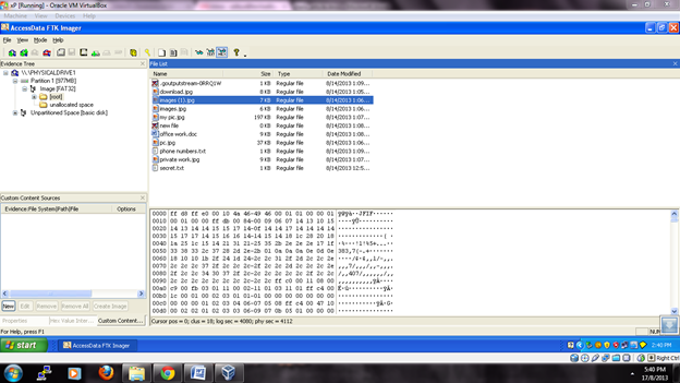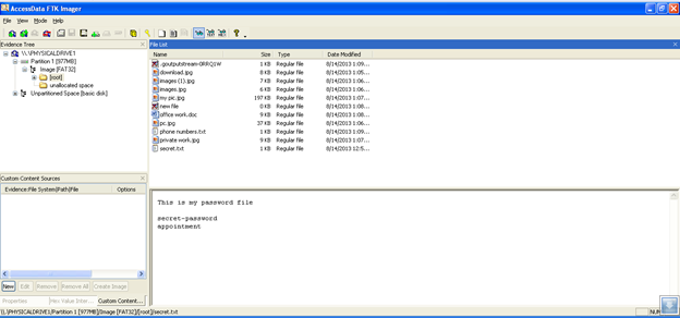 We added the evidence item successfully to the FTK Imager and now you can see the items contained within the evidence in a tree view. Also notice that the crossed file (new file), which is the deleted file from the USB, can also be seen here. FTK Imager also gives us a view of the file contents below.