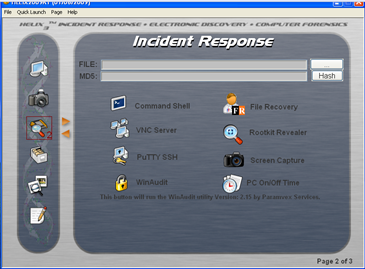 We have some small but very important tools as well to manage our investigation needs, including a command shell, file recovery tools, VNC server for remote access to the system, Rootkit Reveler, Putty for SSH access, screen capture, WinAudit, PC On/Off Time