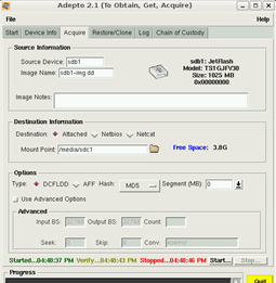 Now let us move on to Acquire to mention the source and destination along with the hash verification we wish to use and then press Start.