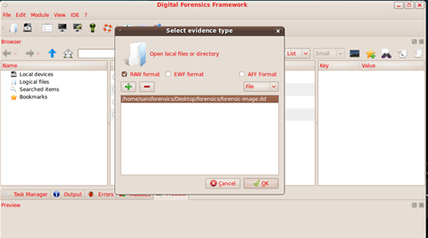 It supports evidence formats such as raw format (.dd), encase image file format (E01), and advanced forensics format (AFF).