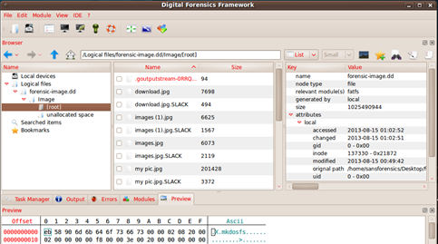 This time we take another forensic test image for contrasting the results and views better for the understanding of the readers, since this image specifically has images, doc files, txt files, etc.
