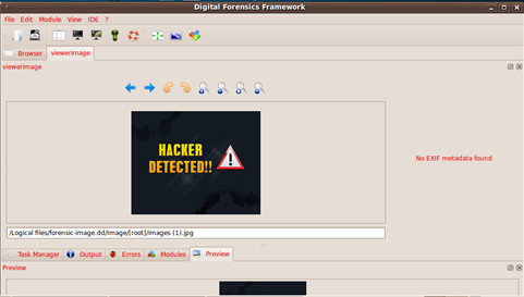 We notice that all the files have been listed under the root partition. Since we just have one partition in this image we can see that this partition has image files, text, and document files. Now, in order to further analyze them, suppose an image file: We use the picture module: