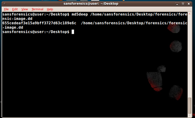 This is a small command line utility in SIFT that may be used for calculating MD5 hashes, comparing hashes, and playing around with them. Suppose we want to check if the integrity of our file is maintained: We can simply hash it and check. Any changes made to the file will change its MD5 hash. So let's calculate an MD5 for our image file before doing the forensic analysis. You can see the MD5 calculated in the screenshot by our tool: