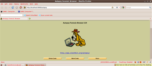 Now we move to the actual analysis of our image using Autopsy. This tool is the GUI front end for the Sleuthkit. Let us have a look. It is found under Applications > Forensics