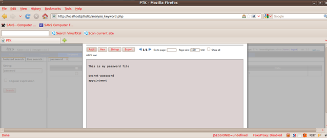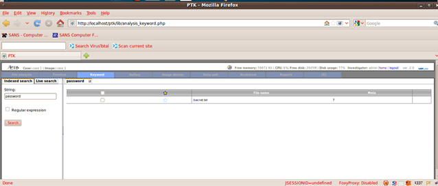 PTK has a keyword search that helps to do searches for important keywords during a forensic investigation. We here search for the keyword "password," let us see if it fetches some good results for our investigation. On searching for this keyword, we find a file named secret.txt which contains the keyword. This keyword searching may give a lot of important information during an investigation and is hence very important.